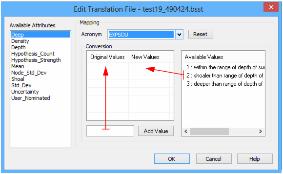 If no mapping is possible between the selected attribute and the chosen S-57 attribute acronym, “No conversion available” is displayed.