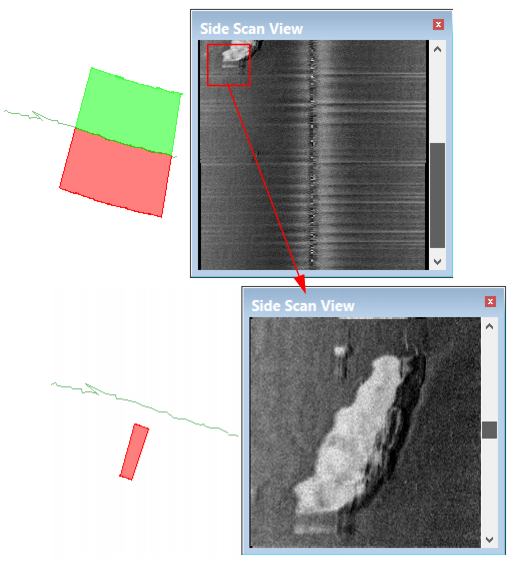 As the data in the zoomed area of the Side Scan View is magnified, the coverage outline in the Display window (which indicates the location of the data in the View) becomes smaller. When zooming out, this is reversed.