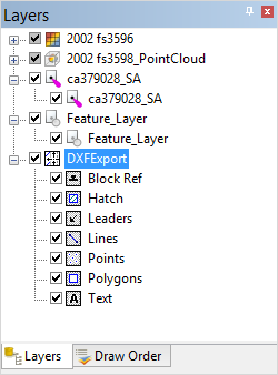 If you open a DXF file in a CARIS application, a parent layer is added to the Layers window with sub-layers for each supported data type.