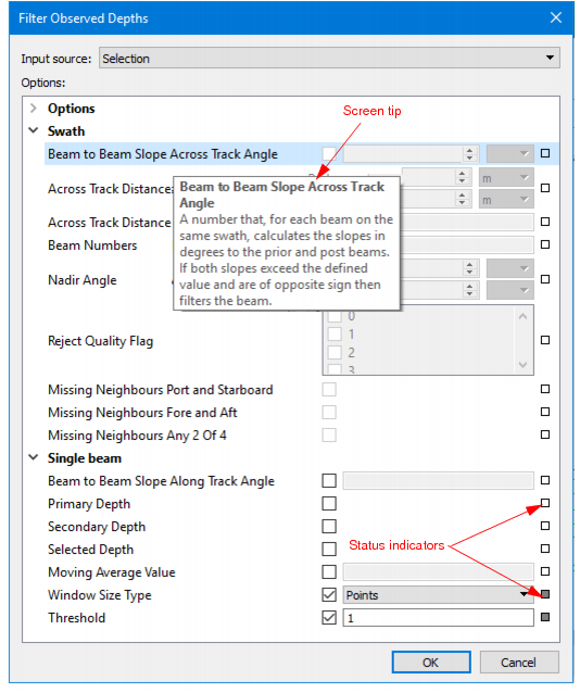 The Filter Observed Depths dialog box is used for both Swath and Single Beam filtering.