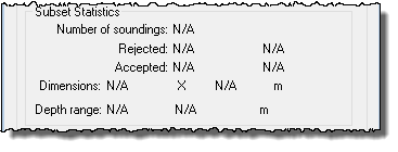 | Each time a subset is generated, the following information is displayed: • total soundings in the current subset • number and percentage of soundings with Accepted and Rejected status • dimensions of the subset • minimum and maximum depth levels within the range of the subset.