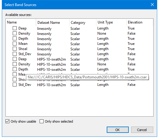 The dialog box displays all open raster bands that are of the selected band category, in this case Scalar was selected. The order of the bands listed here can be changed by dragging and dropping. The path to each band is displayed as a screen tip.