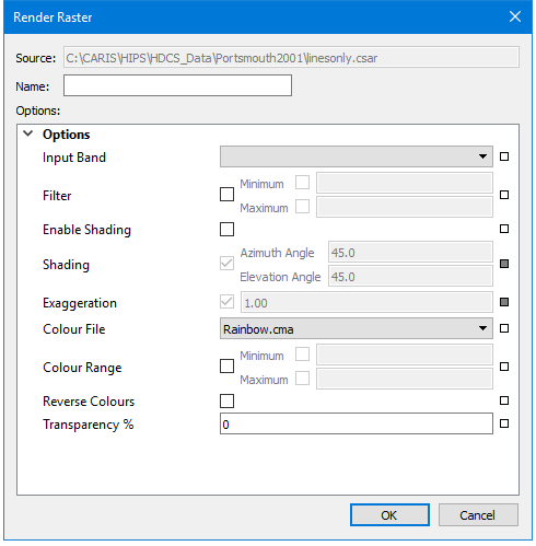 Colour File | The colour map file to use when rendering the raster. The list of available options is populated with all colour files present in the directory specified for the Colour Maps option in Tools > Options. |