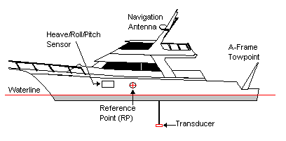 The location of the RP depends upon the type of sonar system used in the survey. Its location is usually at the centre of gravity of the ship. This position is used as the centre of the ship’s rotation when applying the pitch/heave/roll parameters, and must be applied as accurately as possible.