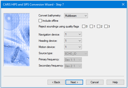 4. For multibeam data, select the number for the Navigation, Heading and/or Motion devices, from their lists, to convert data from that specific device. (Devices are numbered 1 to 5.)