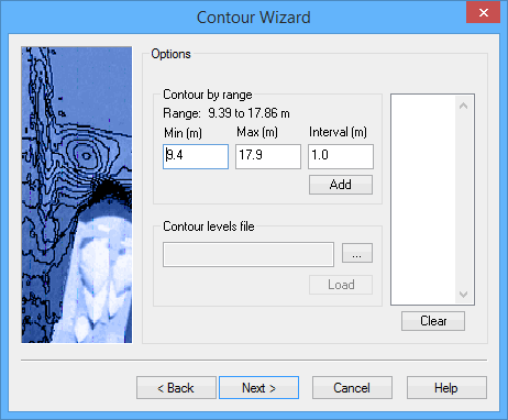 The list box at the right will be populated with the contour levels. The list can be edited using a pop-up menu, if necessary. For more information on contouring, see the Contouring topic in the Tools Menu chapter of the CARIS BASE Editor Reference Guide.