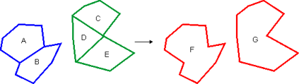 In this example, five areas are selected. Areas A and B have a common boundary and areas C, D, and E have a common boundary. The result is two new areas, F and G