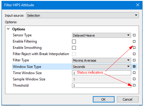 The Attitude filter is used to reject attitude that falls outside of defined boundaries. Use the Filter HIPS Attitude dialog box to select the sensor attitude data to filter, enable filtering and smoothing functions, and set the type of, and parameters for, filtering, and then apply filtering.