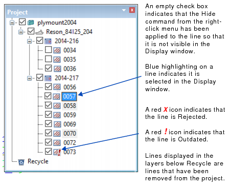 When a project is first opened all lines are set to be visible in the Display, as indicated by a check mark to the left of each line. Expand the project tree by clicking the plus sign (+) to reveal the layers of the Project/Vessel/Day/Line hierarchy.