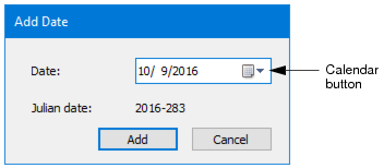 The Add Date dialog box displays the current date in month- day- year format, and the Julian date equivalent.
