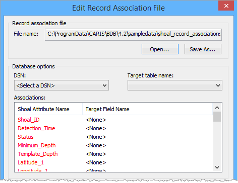 Depending on the target table selected, the Association table may or may not have attributes associated with fields. In this table you can assign the shoal attributes to fields names.