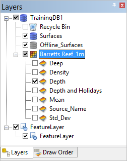 The surfaces are opened in the Layers window as child layers of the database query layer.