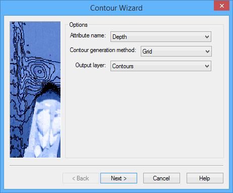 In this step you need to specify the attribute name, the gridding method, and the output layer for the contours. The attribute is the layer of the surface that will be used as the height source for creating the contours. The output is the feature layer that will be used to store the contours. The gridding method is one of Grid or True Position.