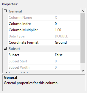 Column Multiplier | This property is used to scale the data during import. Coordinates need to be in the same unit as expected for the coordinate reference system (CRS) specified for the input. If the ASCII file contains coordinates and elevations in feet, for example, but the input CRS is defined as having coordinates and elevations in metres, it is necessary to apply a scaling like 0.3048 to both X and Y columns to have the data be positioned correctly and to the Z column for correct elevation values. Any number is accepted for this value and a different scale can be specified for each column. If no scaling is required, leave the default 1.0. | |