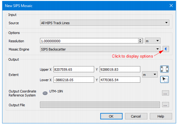 The New SIPS Mosaic dialog box is structured to hide fields that are optional for the creation of a mosaic. These include options such as imagery correction, filtering, weighting etc, that are displayed based on the type of mosaic engine selected. These can be displayed by clicking the blue arrow the right of the Mosaic Engine field. Options vary with the choice of engine.