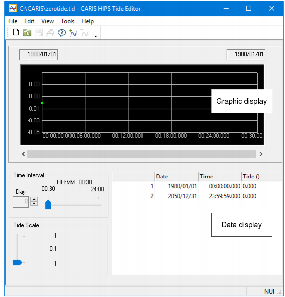 The tide file is displayed in the editor.The top part of the editor shows a tide versus time graph of the data. Tide-level values are represented on the vertical axis. Time is represented on the horizontal axis. These can be adjusted using slider controls.