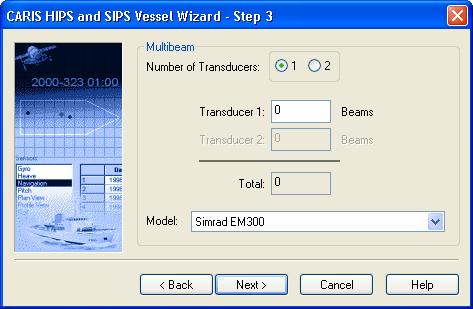 If you selected Multibeam in the Step 2 dialog box, Step 3 will ask you for information on the sonar model and number of transducers.
