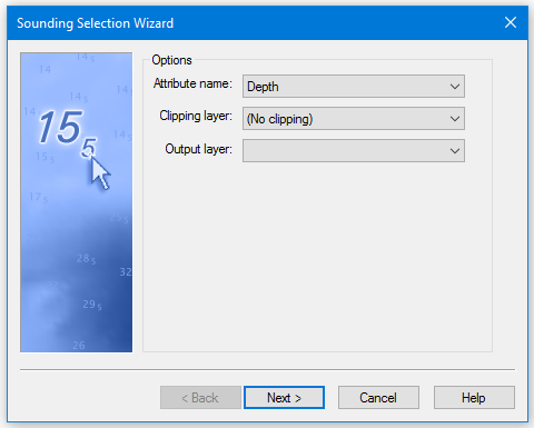 The wizard uses the values from an attribute layer of the selected surface as the height source for Sounding Selection. If a layer was selected in the Layers window when the wizard was opened, that layer will automatically be displayed in the Attribute name field.