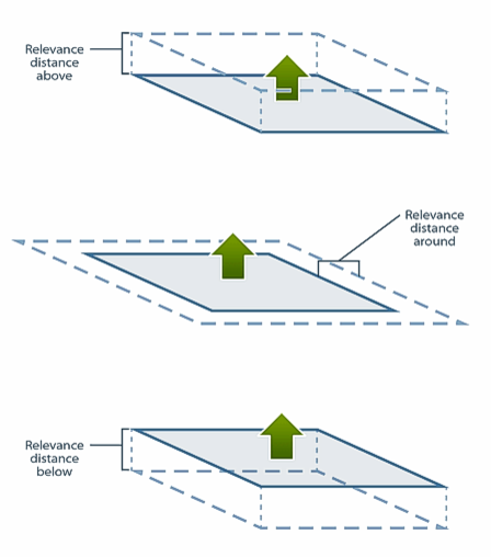Relevance distances define the distance from a plane to be considered when importing data and creating raster surfaces relative to reference model surfaces, such that distant irrelevant features are not included. Relevance distance can be set above, below or around a plane.