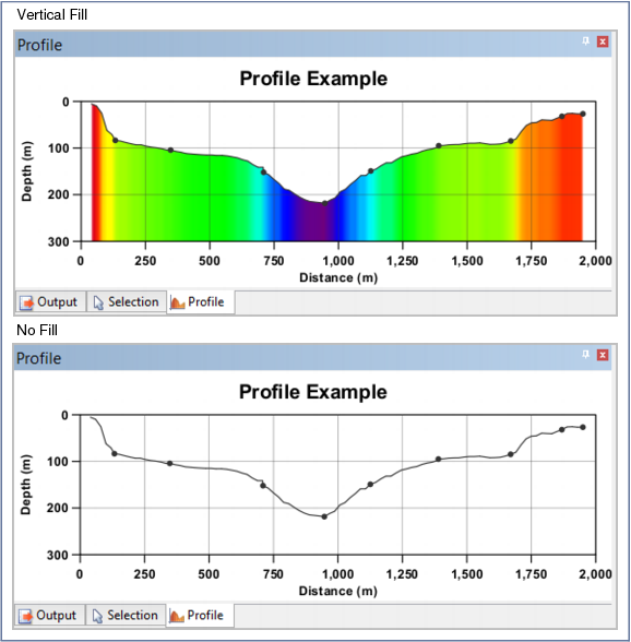 Fill Type | This option colours the profile according to the elevations in the data. You have the option of having no fill, or applying colours horizontally or vertically. Vertical and horizontal fill options are disabled if more than one height source is profiled. |