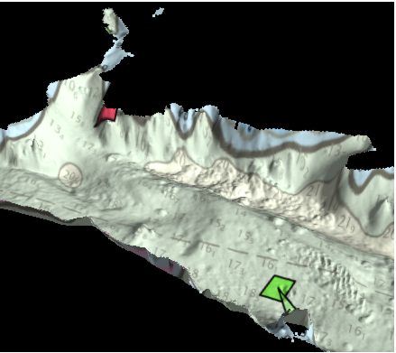When draping vector data, the Offset property can be used to display the vector data at a specific height above the raster data. Also, the Clip to Terrain property can be used to only display the vector data that is within the extents of the raster data. This property is set to True by default. Below are examples of a raster surface with an ENC draped over it; one with Clip to Terrain set to False, one with Clip to Terrain set to True.