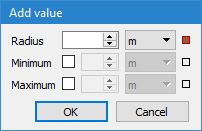 Minimum Distance | The minimum distance between points in the output point cloud. Points from the input that are closer than the minimum distance will be removed during thinning. The distance can be specified as either a single radius value or a set of intervals and radii. • For a single radius value, the application will ensure that no two points are closer than the minimum distance. This value is entered as either a distance on the ground or a distance at map scale, depending on the Scale value, and is applied to the entire band. • Sets of intervals allow a different radius to be used at different value ranges. This is beneficial if data is more dense at lower values, requiring a smaller radius to apply more thinning, while the data is less dense at higher values, requiring a larger radius to perform less thinning. To specify a minimum distance interval, you must provide the radius distance and the minimum and maximum values of the range for which to use that radius. If there is a gap between the range values specified, the application will use linear interpolation to select radii for those values. 1. Click the Add button to launch the Add Value dialog box.