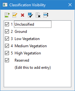 Subset Editor provides tools for working with the classifications imported from Lidar data. The available classifications include ones defined in the LAS standard, as well as user-defined values.