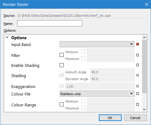 Colour File | The colour map file to use when rendering the raster. The list of available options is populated with all colour files present in the directory specified for the Colour Maps option in Tools > Options. |