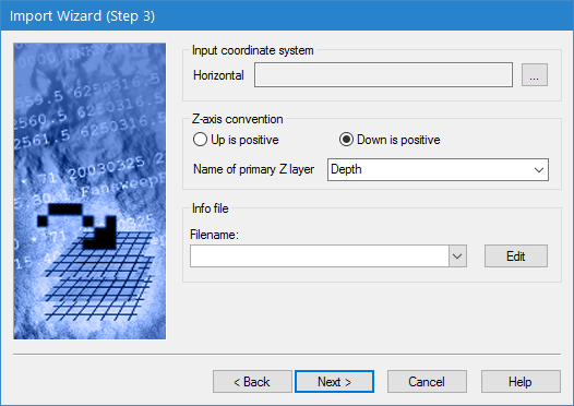 Z-axis convention | The Z-axis convention of the source data. Select Up is positive if the source data contains elevation values that are positive up. Select Down is positive if the source data contains depth values that are positive down. |