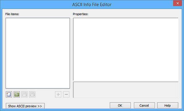 When the Editor is launched from the ASCII Info File Editor command, all controls will be empty and the ASCII preview will be hidden.