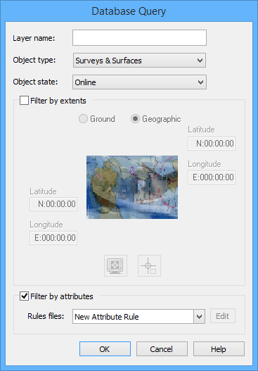 • By Rule File: This command is accessible from the Create menu and the pop-up menu for the database connection layer. This command is used to apply an existing rule file to the database to create a temporary query layer based on the defined rule. See Query by Attribute Value for more information on filter layers and Query by Rule File for more information on this tool.