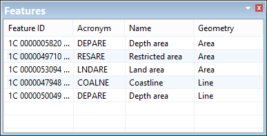The Features window lists all features that share a spatial component with a selected feature.