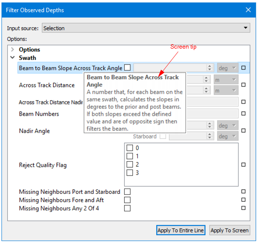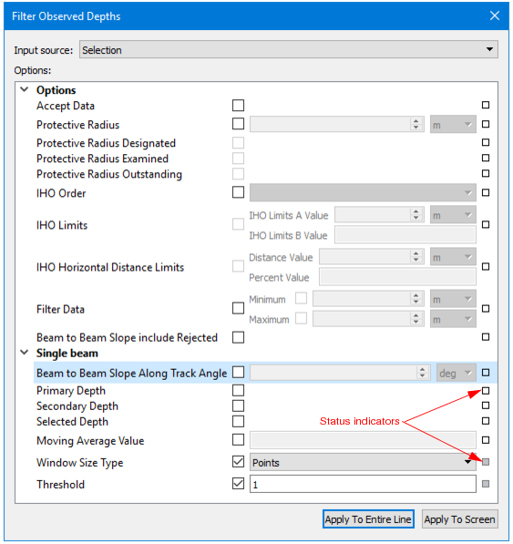 A customized version of the Filter Observed Depths dialog box is used for both Swath and Single Beam filtering.