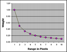 The following graph demonstrates range weighting using distance from a node in units of pixels (multiples of the surface resolution).
