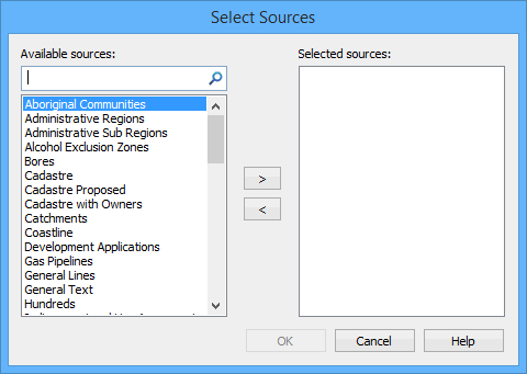 Available Sources | A list of all available sources. To search for a source, type in the search box and click the search tool. To select a source, highlight it and click >. The source is moved to the Selected sources list. |