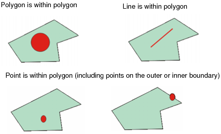 <GeometryIsWithin/> is true if a feature’s geometry is completely contained by the geometry of a second feature.