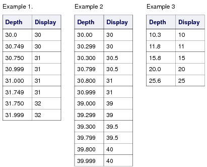 Threshold | Range limits are defined by threshold attributes. Each range is defined using shallowest sounding or maximum drying height within the range. The order is from the deepest sounding to the highest drying height. The following list is an example of the threshold order <!--This range applies to all soundings 30 metres or deeper.--> <Range Threshold="30"> <Element Precision="1.0" Rounding_point="1.0/> </Range> <!--This range applies to all sounding between 20 and 29.999--> <Range Threshold="20"> <Element Precision="1.0" Rounding_point="1.0/> </Range> <!--This range applies to all soundings between 19.999 and 0.--> <Range Threshold="0"> <Element Precision="1.0" Rounding_point="1.0/> </Range> <!--This range applies to all drying heights between -0.999 and -10 .--> <Range Threshold="-10"> <Element Precision="1.0" Rounding_point="1.0/> </Range> <!--This range applies to all drying heights -10.999 and -20.--> <Range Threshold="-20"> <Element Precision="1.0" Rounding_point="1.0/> </Range> |