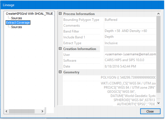 Use the Lineage property in the Properties window to see operations that created the surface, any source files that contributed to the data, any filters that may have been applied during extraction, as well as any other creation properties that exist for the surface.