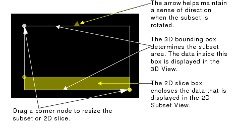 The amount of data viewed in Subset Editor is determined by the subset bounding box. As the bounding box area is changed, a new subset is generated and the displays in the 2D and 3D Views are refreshed to show the new area.