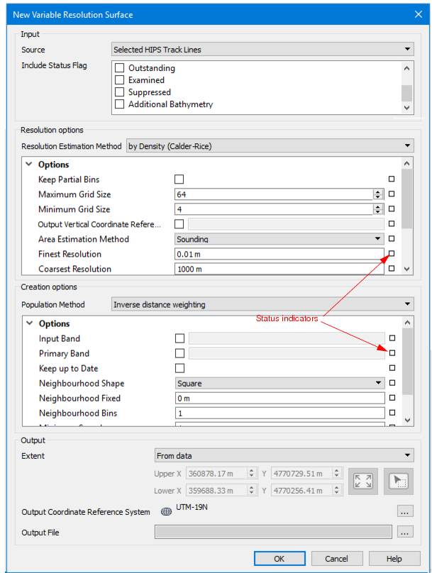 Variable resolution surfaces can be created from track lines, raster surfaces or point clouds. Parameters for creating the surface are set in the New Variable Resolution dialog box: