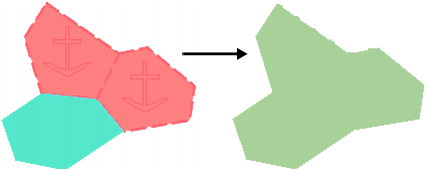 Merge two or more areas into a single area. The merged area inherits the acronym, attributes, and feature object ID of the superselected area and consists of the combined geometry of all selected areas.