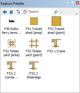 The Feature Palette displays features as symbols. The symbols can represent features in the catalogue or features that have been added or modified through the Feature Palette itself.