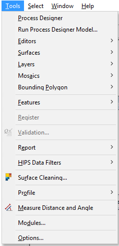The Tools menu contains commands to create and edit surfaces and mosaics, to run interpolation or shifting of navigation data, to set and apply filters, measure distances and create beam pattern correction files.