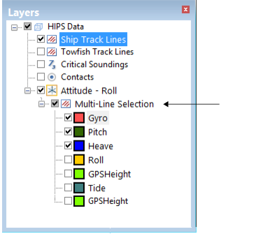 The data from multiple lines can be edited in Attitude Editor. When multiple lines are selected this is indicated in the Layers window.