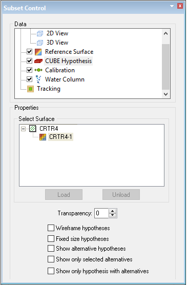 The hypothesis editing options for the selected surface are listed at the bottom of the Subset Control window.