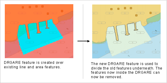 For a simple example, if you add a dredged area on top of an existing depth area, you can cut a hole in the depth area using the dredged area as a cutting feature. This results in three areas. You can then delete the unnecessary depth area that falls within the dredged area.