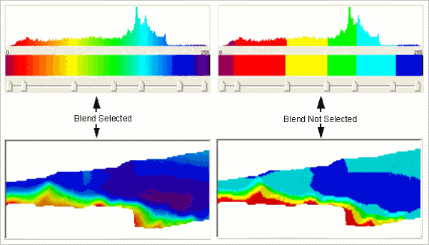 The following images show examples of depth range colours with and without the Blend option selected.