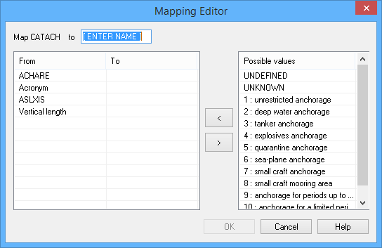 Attribute table | A table of attribute values. 1. Select a row. 2. Select a value from the Possible values list. The selected value is displayed in the To column of that attribute table. 3. Repeat for the rest of the attribute table. |