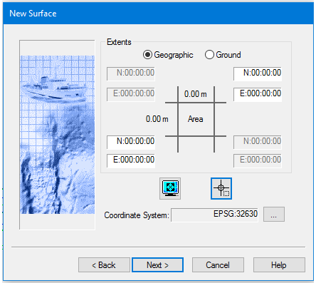 Set the extents and coordinate system of the new surface. The surface will be based on either the data currently visible in the Display window, or within a drawn area.