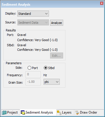 The results of the analysis are displayed in the Results section of the window. Displayed are the type of sediment, based on the values set in the Grain Size table. Also shown is the confidence level in the result (the smaller the value, the higher the confidence level).